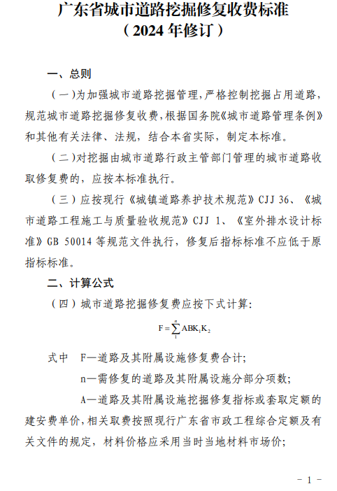 广东省住房和城乡建设厅关于印发《广东省城市道路挖掘修复收费标准(2024年修订)》的通知(粤建城〔2024〕73号)