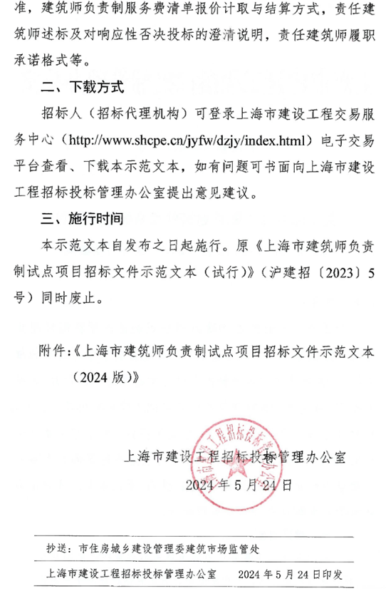 上海市建设工程招标投标管理办公室《关于印发<上海市建筑师负责制试点项目招标文件示范文本(2024版)>的通知》