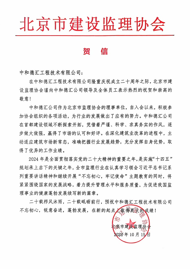 2024年10月15日,正值中和德汇成立20周年之际,公司收到了北京市建设监理协会的贺信。这封贺信不仅对公司过去20年砥砺奋进和卓越成就的认可,更是对我们未来发展的美好祝愿。在这个重要的时刻,我们谨向所有关心和支持我们的朋友及行业协会表示最诚挚的感谢。您们的支持和信任是我们不断前进的动力。