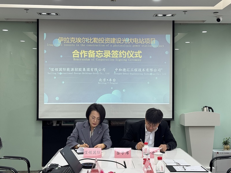 3月11日下午,愷领国际能源控股集团有限公司(以下简称“愷领国际”)与开云手机登录入口(以下简称“中和德汇”)在北京丰台正式完成了关于伊拉克埃尔比勒光伏电站项目的签约仪式。